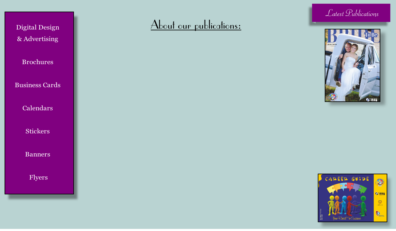This glossy magazine will assist the Bride-to-Be, and all parties involved, with the planning and preparation of their wedding day. This guide has been laid-out in a very comprehensive brochure and will insure that every bride benefits from the editorial contents as well as the products and services, which are offered locally.
